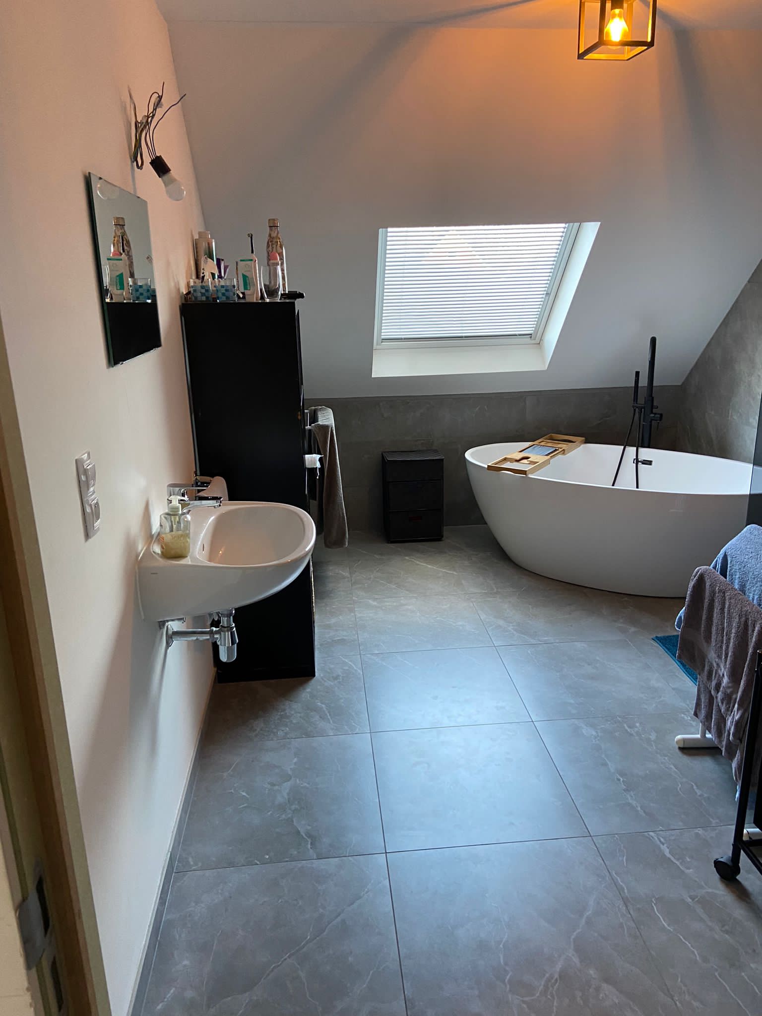 J. en G. wonen in een gezellige woning die helemaal af is, behalve de badkamer. Die was al betegeld en voorzien van een inloopdouche en een vrijstaand bad, maar het ontbrak nog aan een praktisch lavabomeubel. Op dit moment hadden ze enkel een klein lavabo’tje en een los rekje voor handdoeken, wat helemaal niet voldeed aan hun noden. Ze wilden graag meer comfort, meer ruimte en vooral een oplossing die mooi aansloot bij de sfeer die er al was.