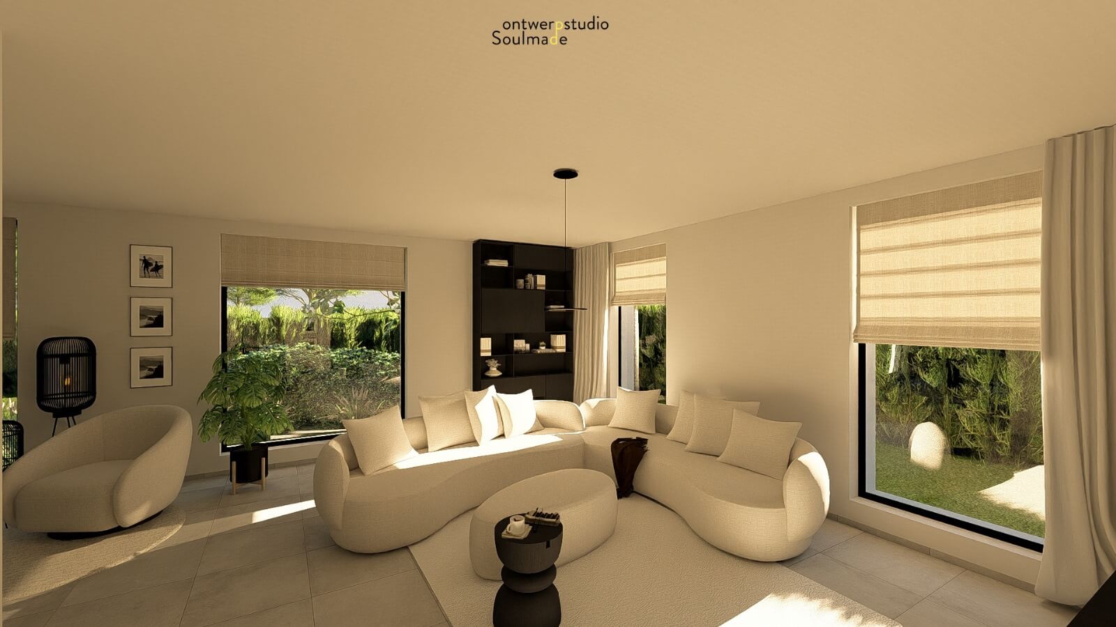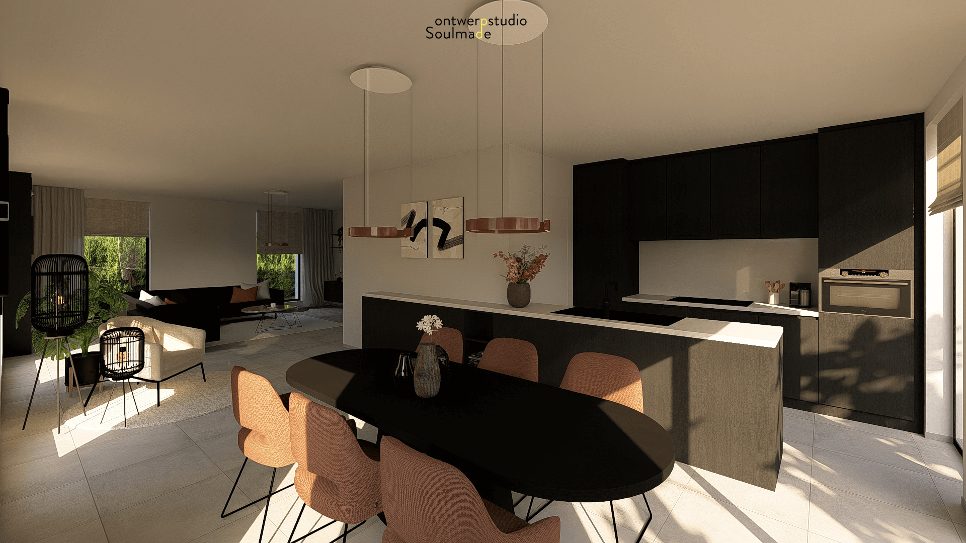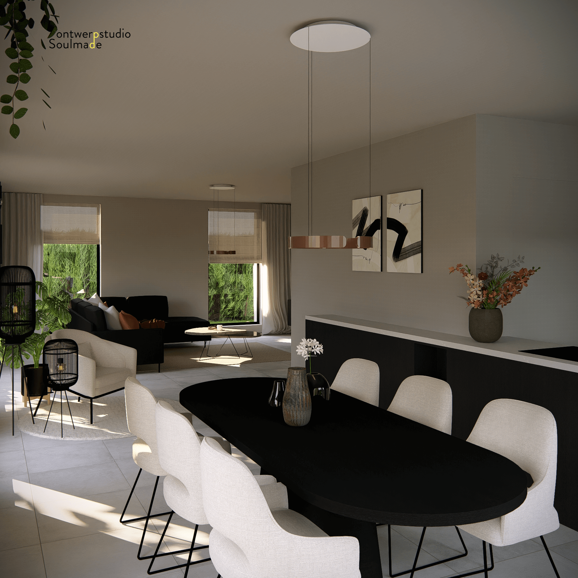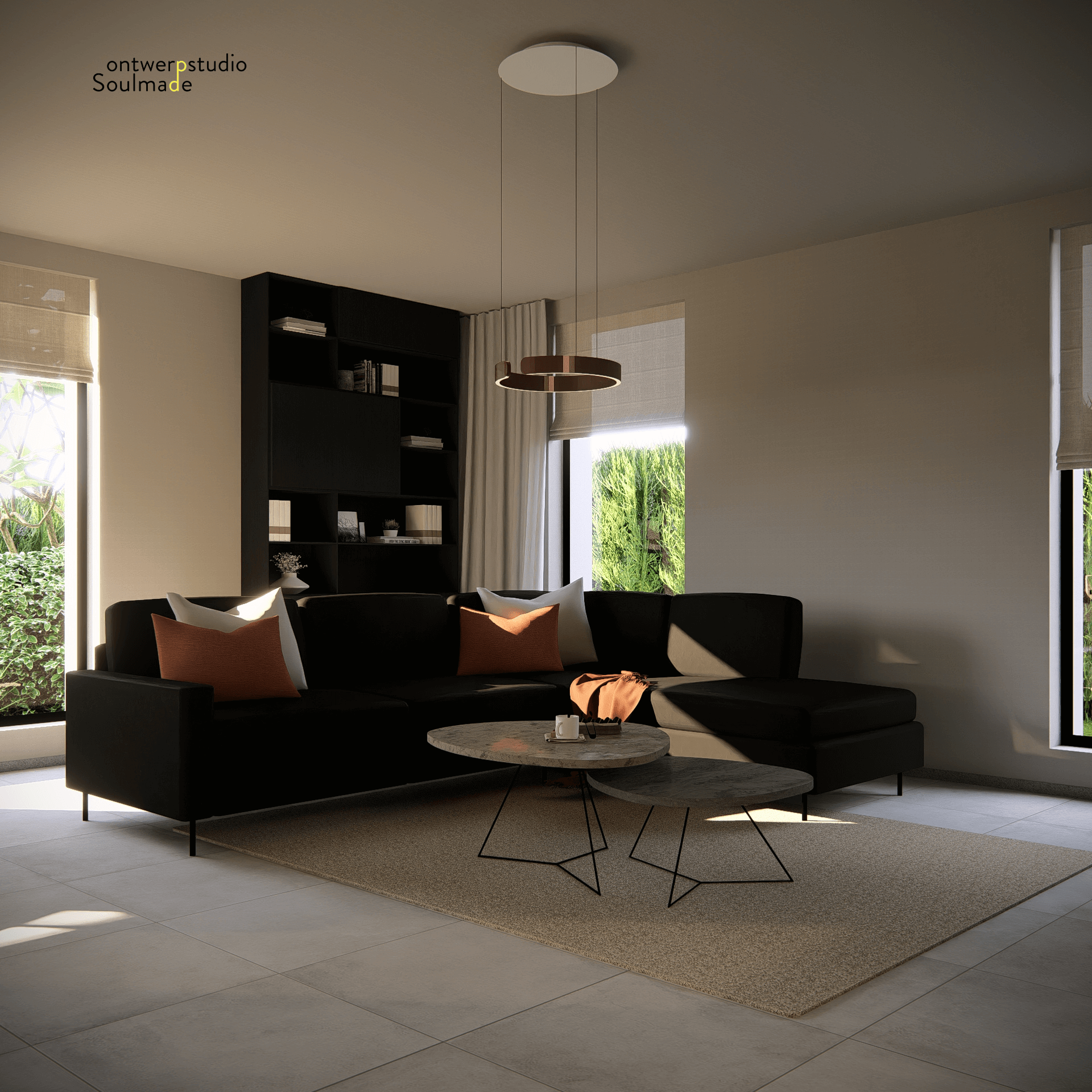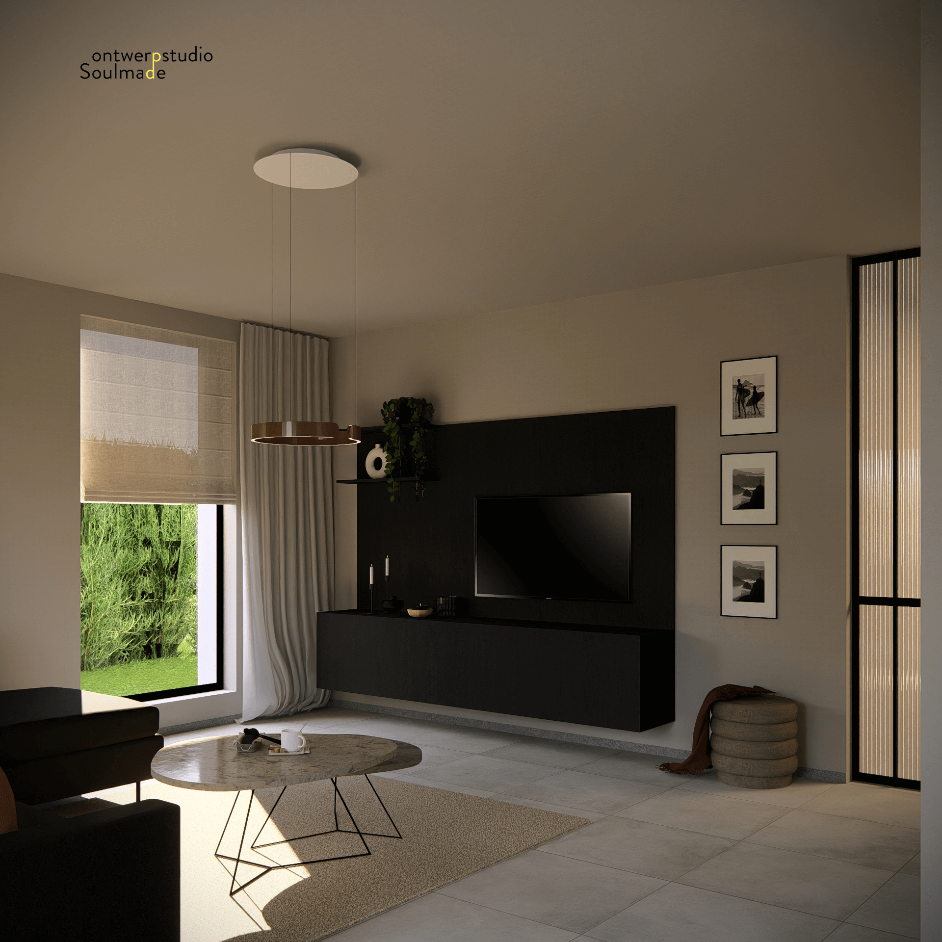 Voor Kim maakte die visuele aanpak een wereld van verschil. De renders gaven haar een helder beeld van hoe haar nieuwe thuis eruit zou zien, waardoor ze gericht meubels kon kiezen en zelfverzekerd beslissingen kon nemen. De toevoeging van gordijnen maakte het geheel nog knusser en warm. Zo werd haar appartement stap voor stap een volledig afgestemde, donkere maar toch lichte en gezellige leefruimte waar ze zich helemaal thuis voelt.