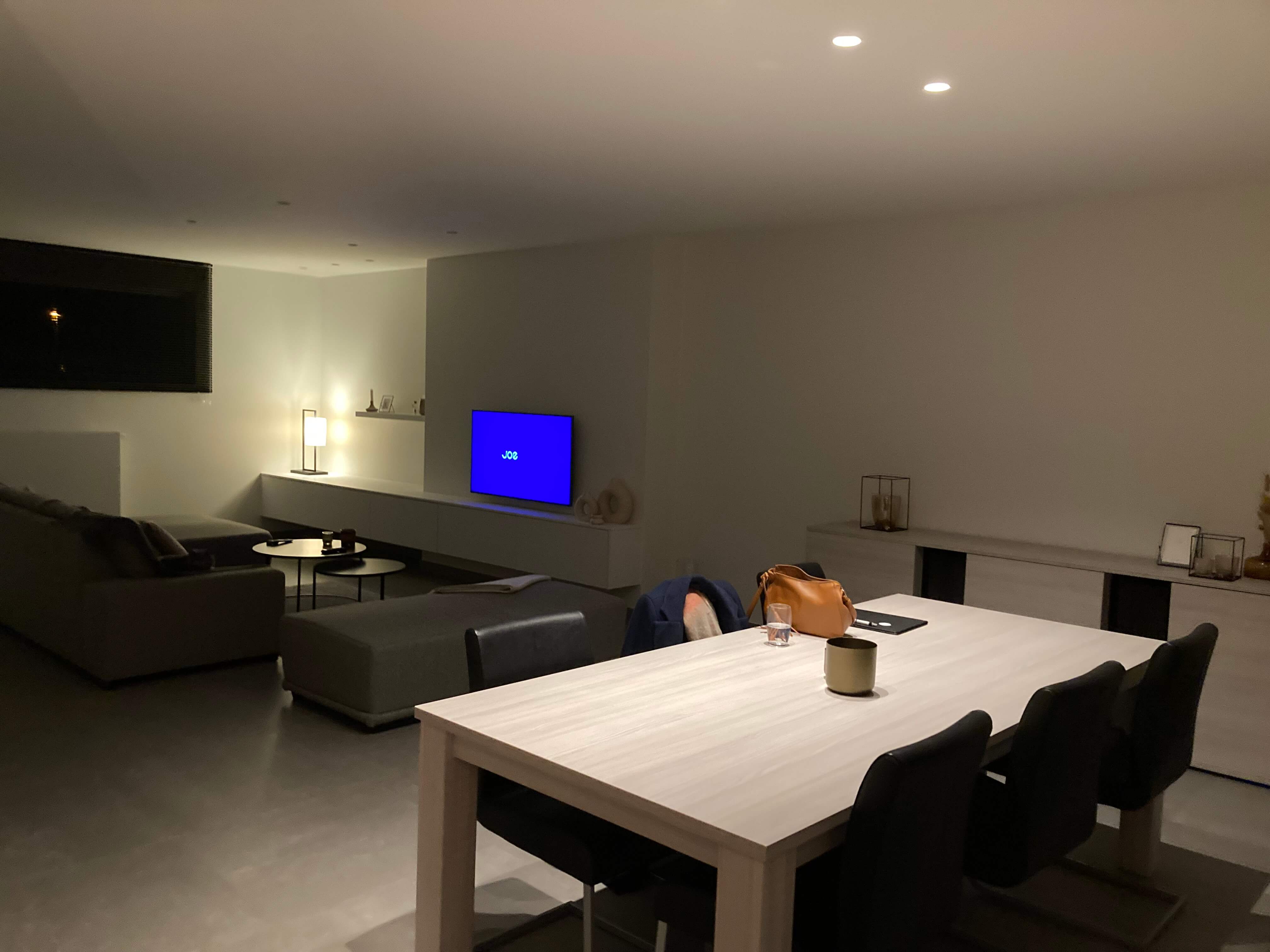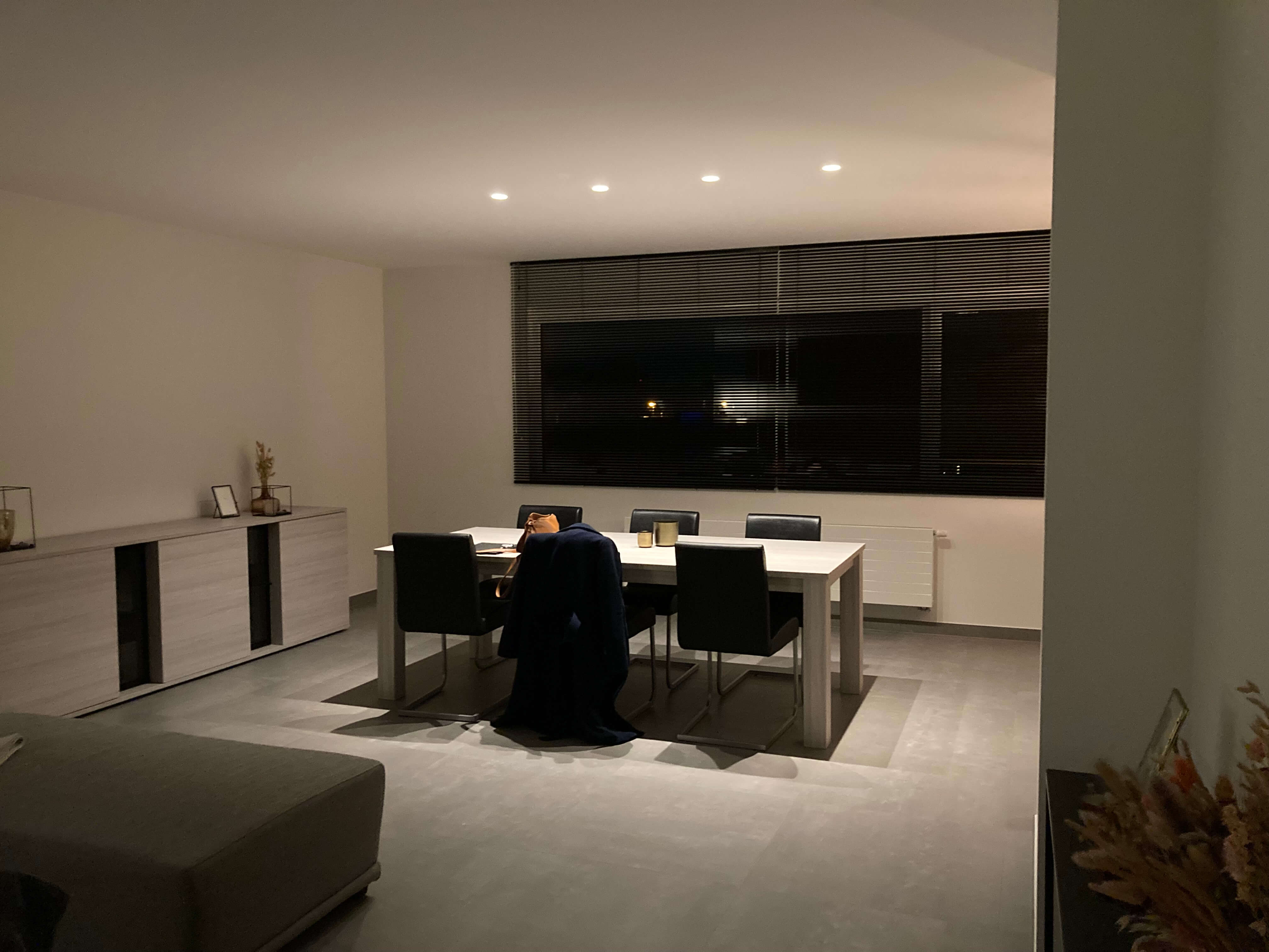 Voor deze klanten uit Beveren was hun rijwoning eigenlijk al grotendeels afgewerkt, maar de eetkamerzone bleef een moeilijke plek. De living was geschilderd, het bestaande tv-meubel op maat beviel hen heel goed, maar aan de andere kant van de ruimte wisten ze niet goed hoe te beginnen. Ze droomden van een gezelligere inrichting, misschien een ingemaakte kast, misschien nieuwe meubels, maar ze wilden vooral vermijden dat het te vol of te druk zou worden. Ze hadden wel een idee van welke stijl ze mooi vonden, maar konden zich moeilijk voorstellen hoe een groot maatwerkelement de ruimte zou beïnvloeden.