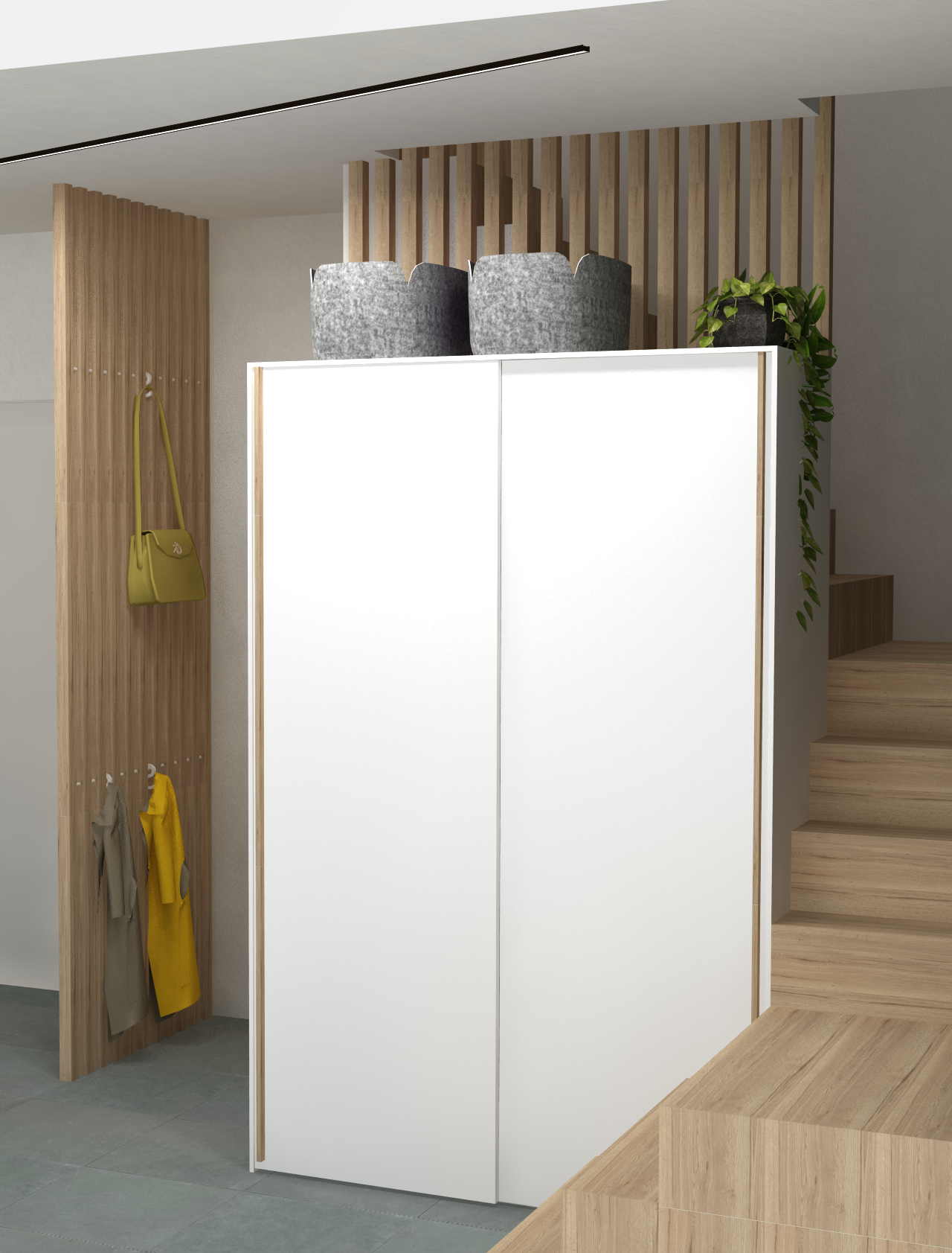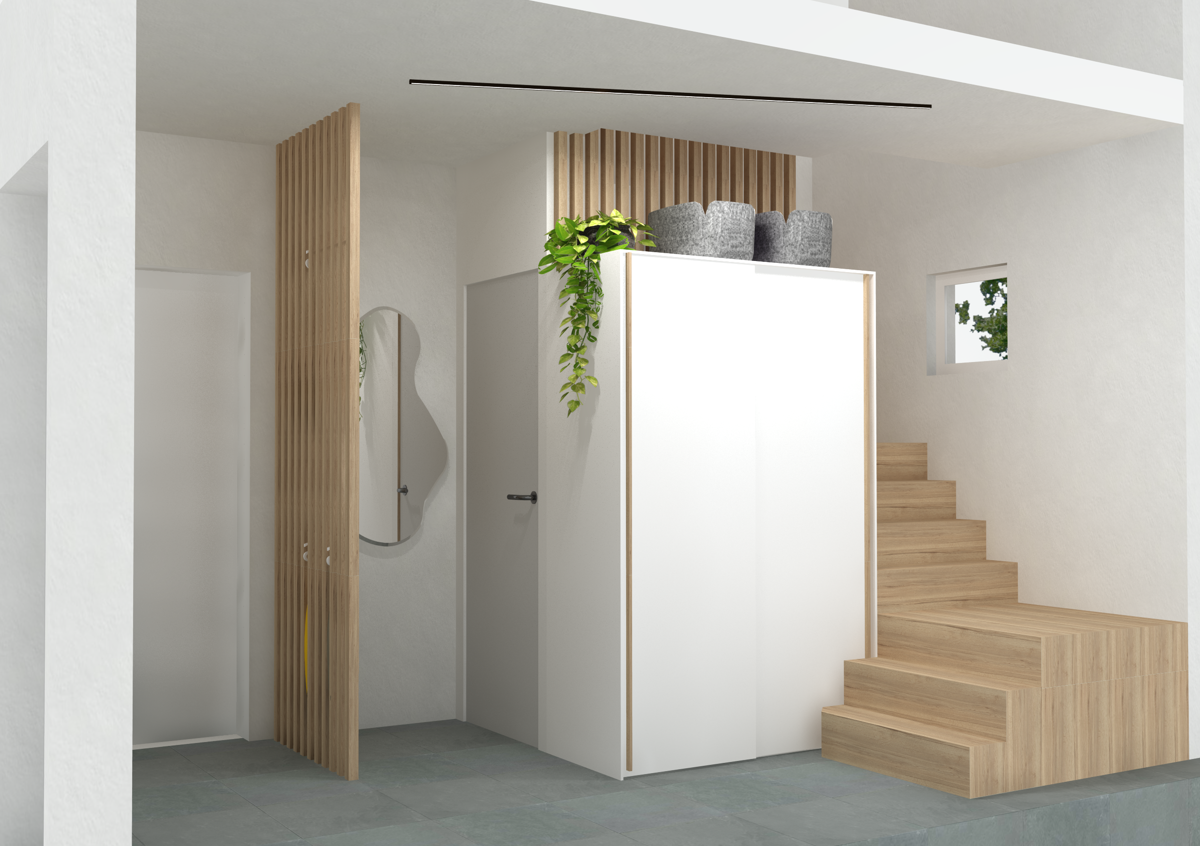 Deze kleine inkomhal had bijna geen opbergruimte en voelde eerder rommelig aan, waardoor de ruimte nooit écht functioneerde zoals de bewoners wilden. Met maatwerk en een slimme indeling hebben we de hal omgetoverd tot een lichte, leuke en vooral praktische ruimte waarin iedereen makkelijk zijn weg vindt. De nieuwe opbergkast werd uitgewerkt in combinatie met enkele verticale houten balken, die niet alleen sfeer brengen maar tegelijk ook dienen als valbescherming voor de trap. Zo kunnen de kinderen volledig veilig op en af de trap bewegen, zonder dat het visueel zwaar wordt.