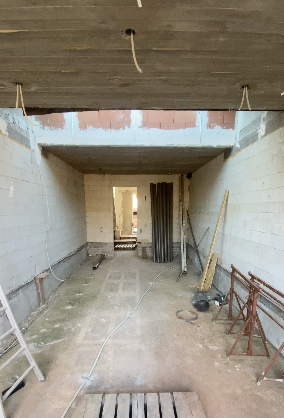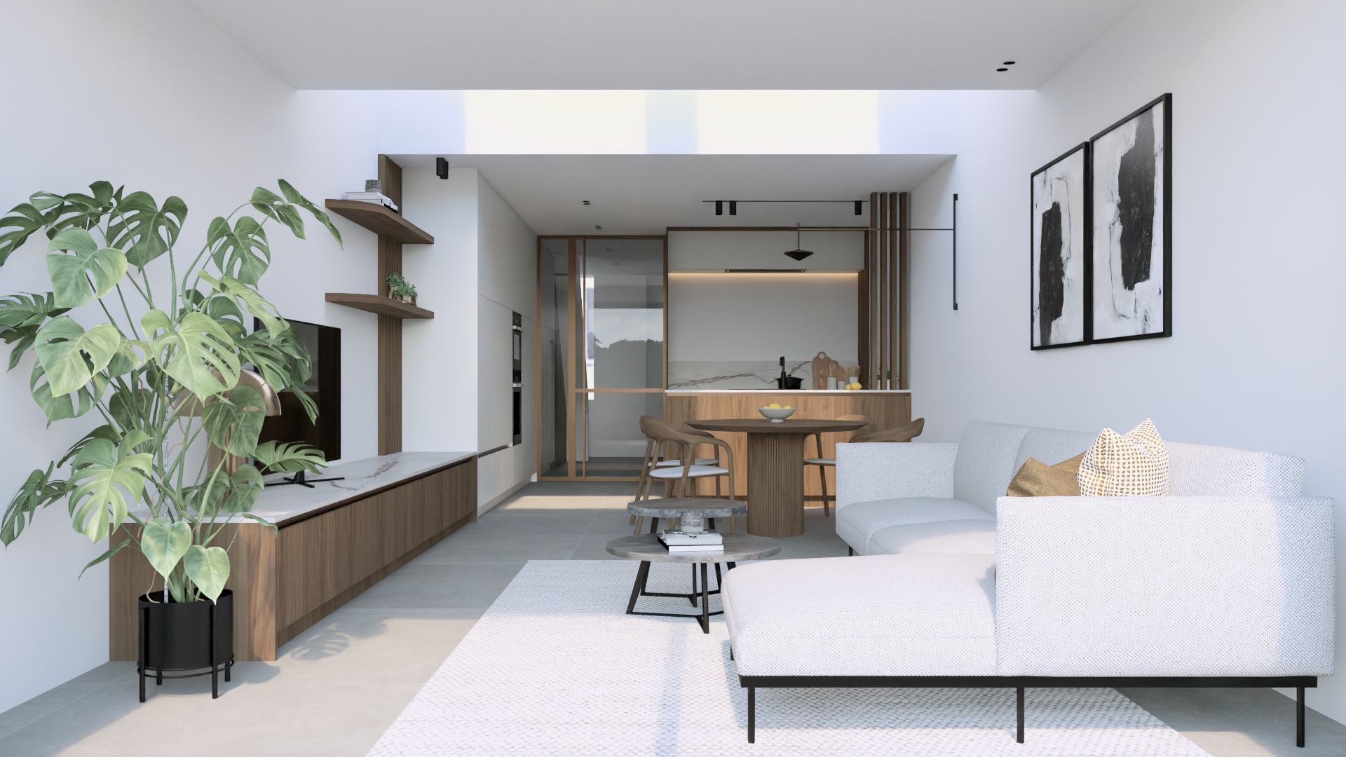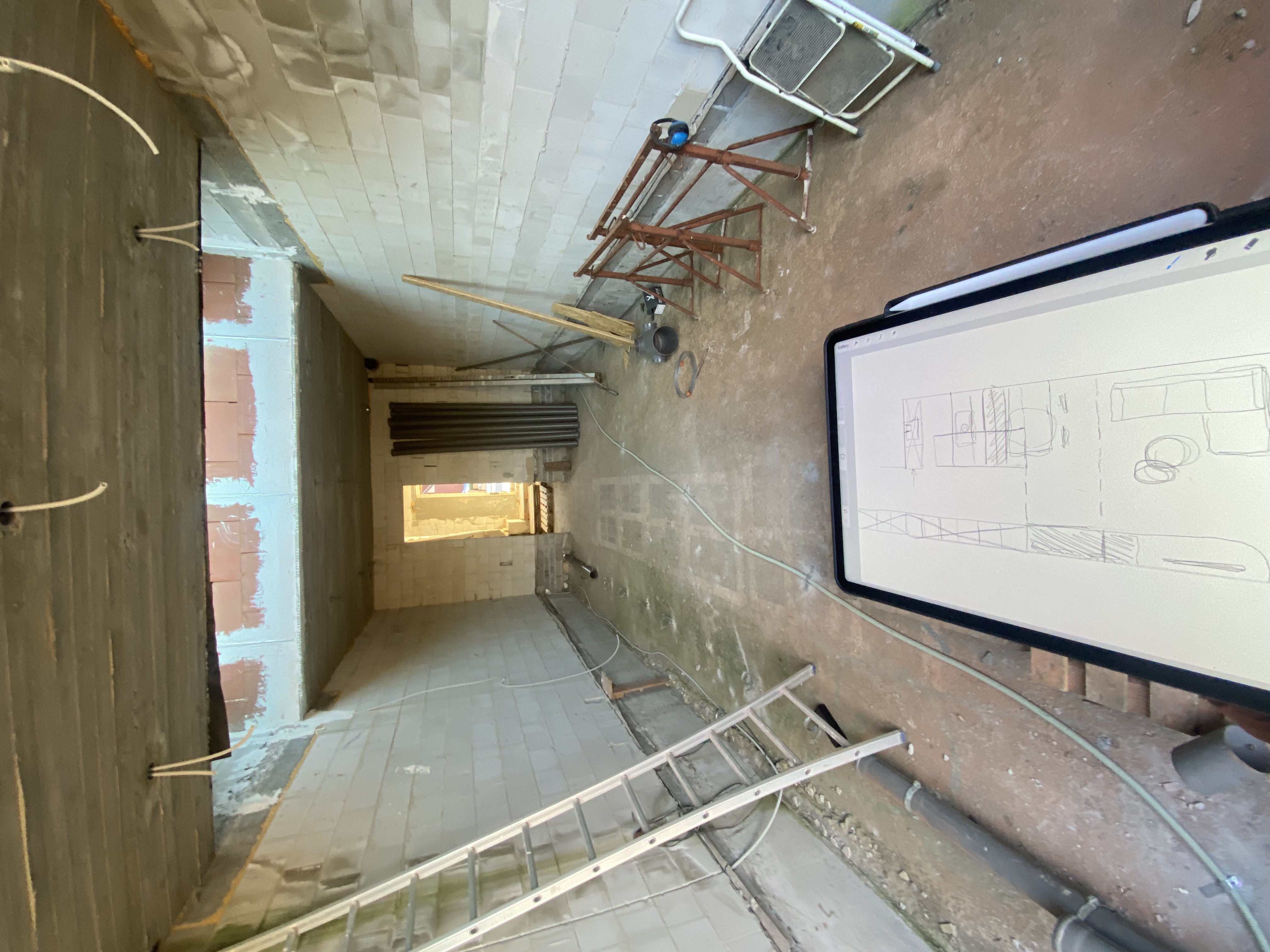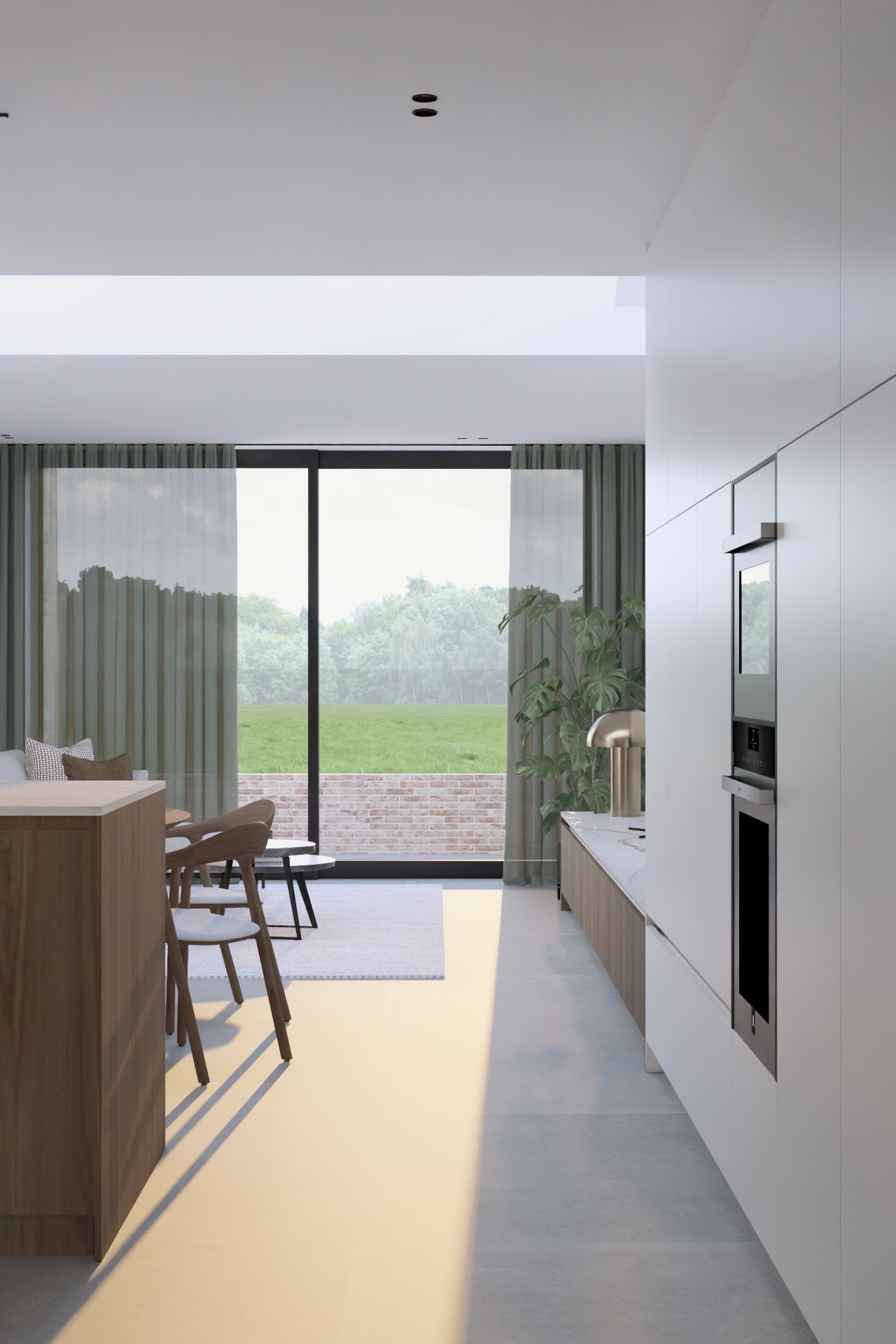 F. kwam bij mij terecht met de vraag om een kleine rijwoning optimaal in te richten, zodat toekomstige huurders enkel hun tafel, stoelen en zetel hoeven mee te brengen. We kozen voor maatwerk dat rust brengt: notelaar hout in combinatie met een keramieken werkblad voor een warme, kwalitatieve uitstraling, aangevuld met slimme opbergruimte die compact wonen comfortabel maakt. Op de vloer komt een lichte maar warme, vierkante tegelvloer van 80cm groot. Tussen de hal en de leefruimte plaatsen we een glazen deur deur waarbij het frame dezelfde kleur van afwerking krijgt als de grepen in de keuken.