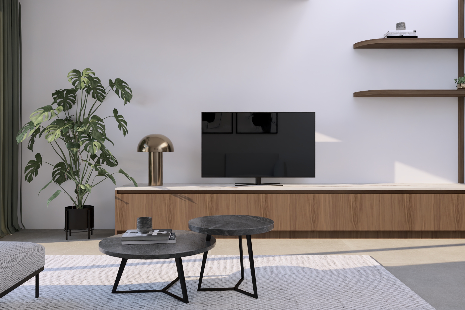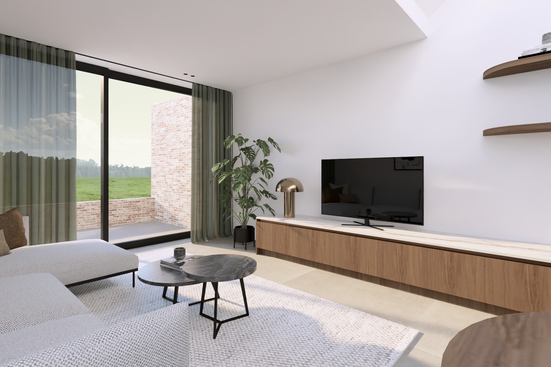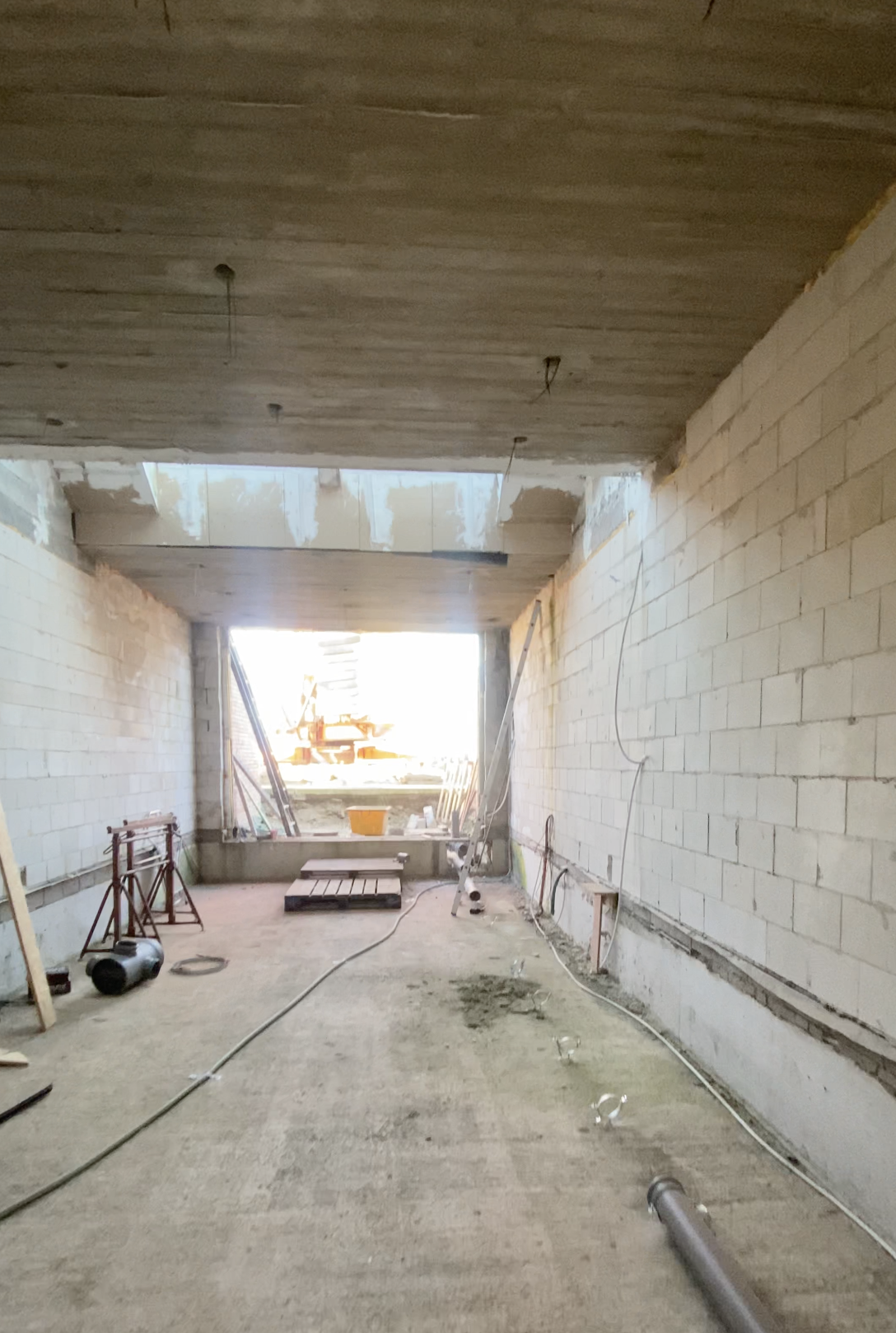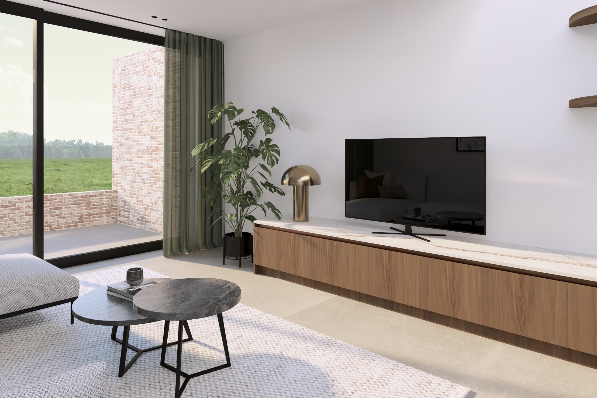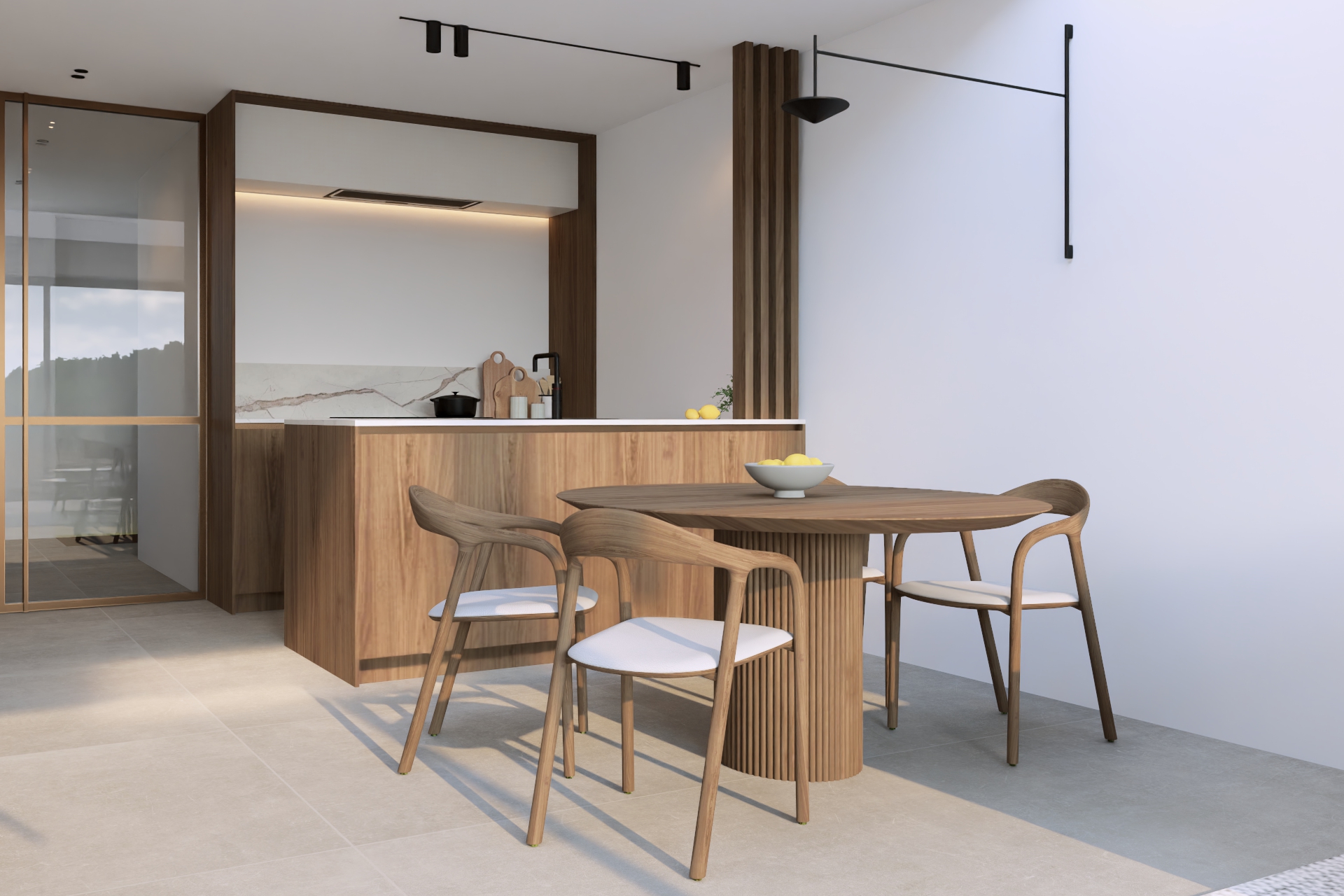 F. kwam bij mij terecht met de vraag om een kleine rijwoning optimaal in te richten, zodat toekomstige huurders enkel hun tafel, stoelen en zetel hoeven mee te brengen. We kozen voor maatwerk dat rust brengt: notelaar hout in combinatie met een keramieken werkblad voor een warme, kwalitatieve uitstraling, aangevuld met slimme opbergruimte die compact wonen comfortabel maakt. Op de vloer komt een lichte maar warme, vierkante tegelvloer van 80cm groot. Tussen de hal en de leefruimte plaatsen we een glazen deur deur waarbij het frame dezelfde kleur van afwerking krijgt als de grepen in de keuken.