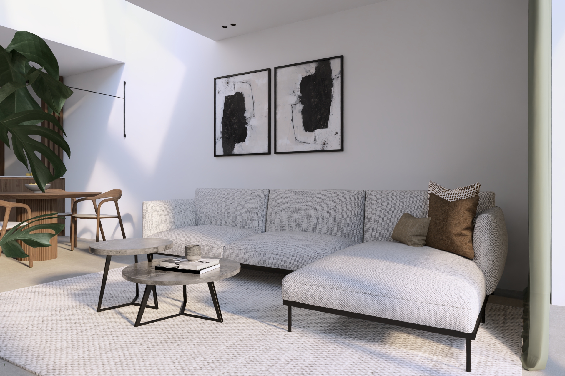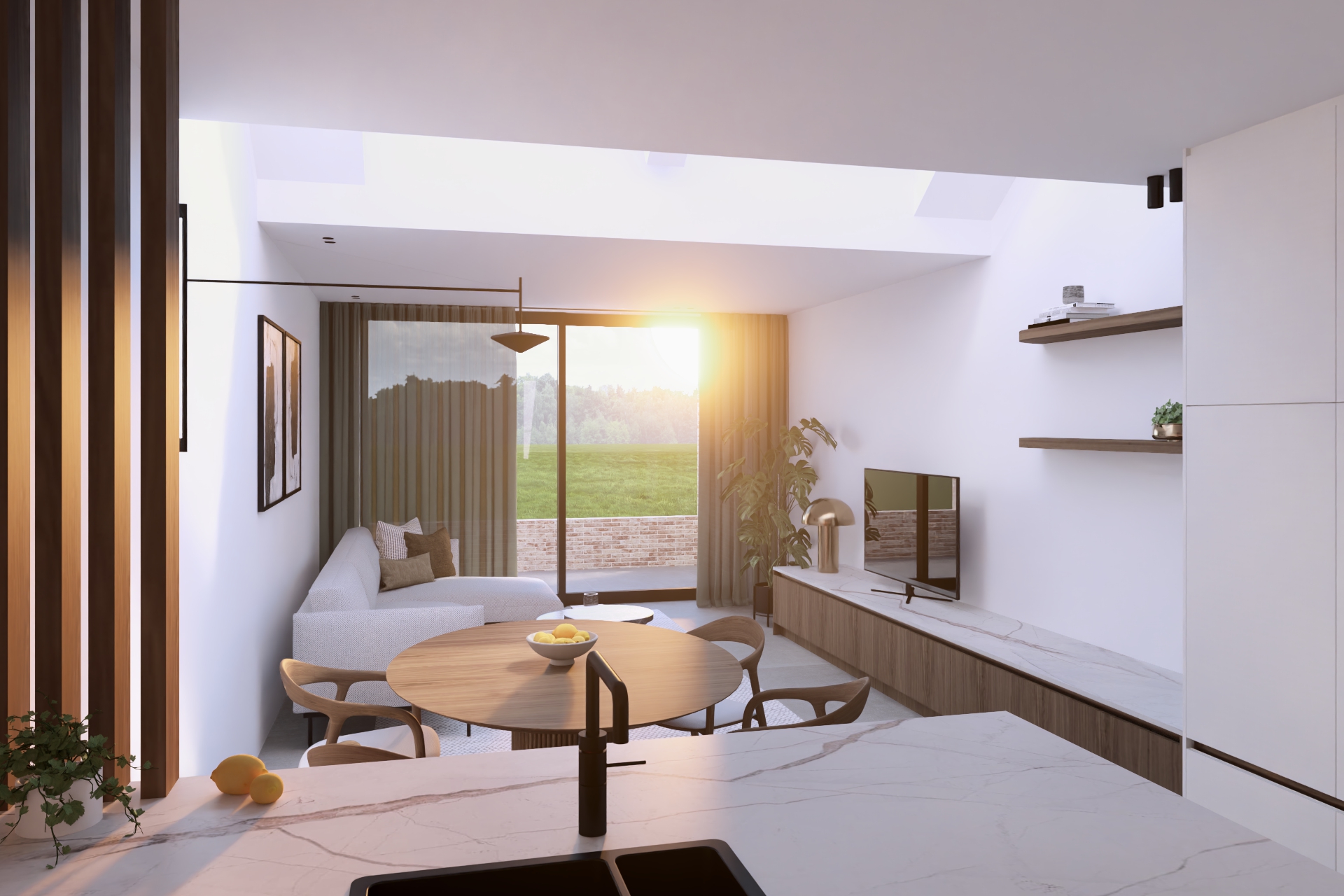 Ondanks de beperkte oppervlakte kozen we bewust voor een schiereiland. Dat lijkt misschien onlogisch, maar door deze keuze krijgt de keuken een eigen zone zonder de openheid van de leefruimte te verliezen. Het schiereiland zorgt voor extra werkruimte, een natuurlijke afscheiding en een luxueuzere beleving — een mooi voorbeeld van hoe interieur op maat een compacte woning écht kan transformeren.