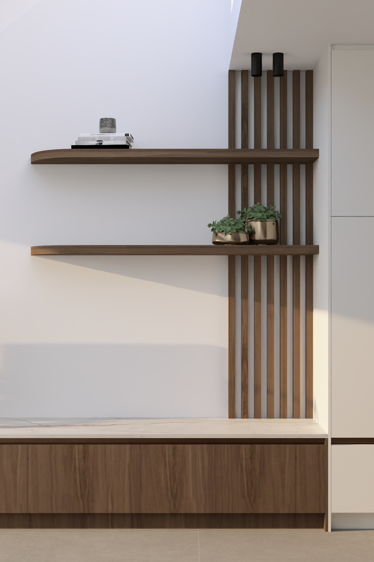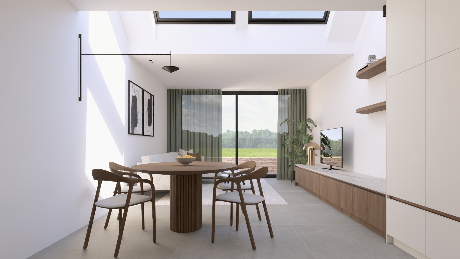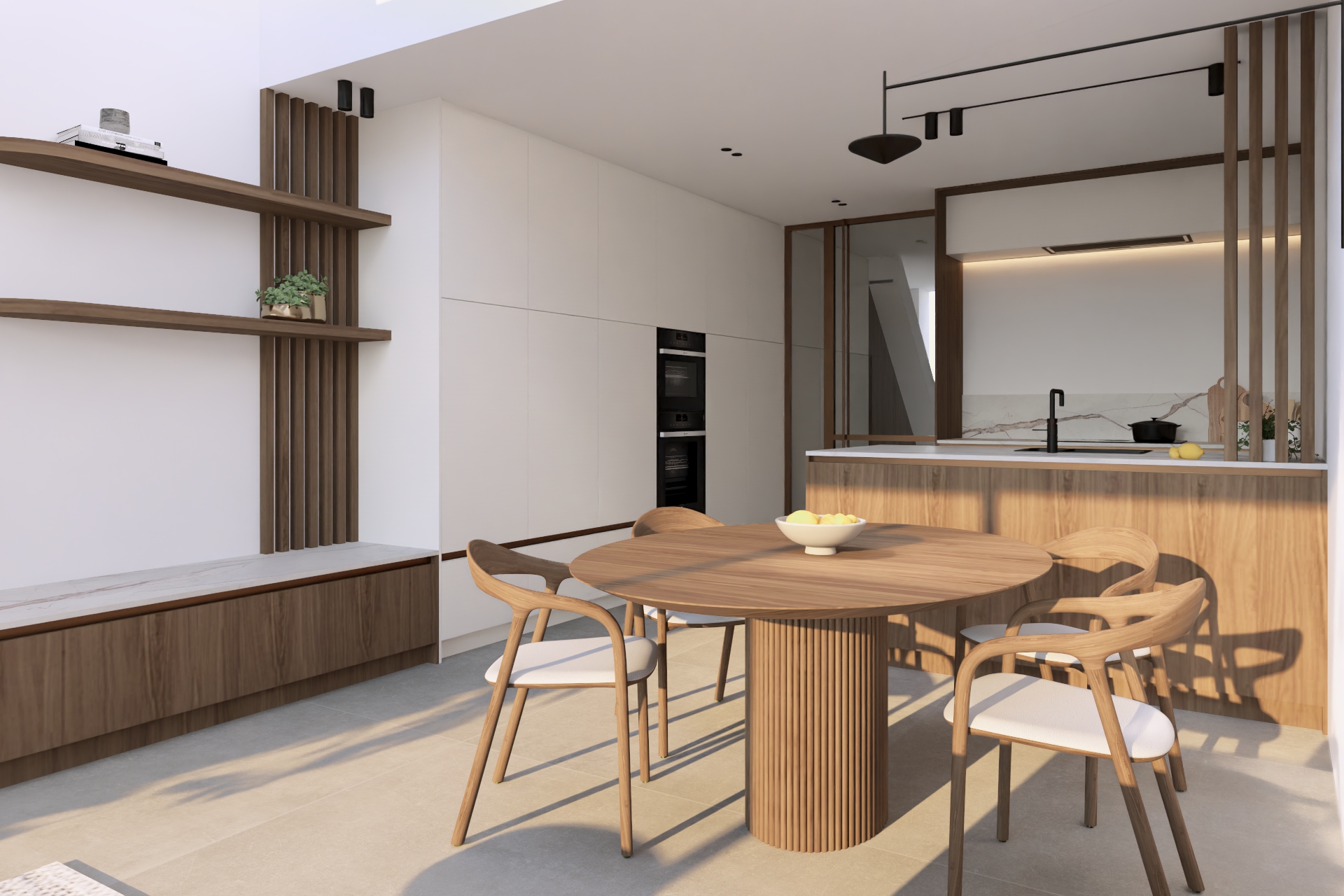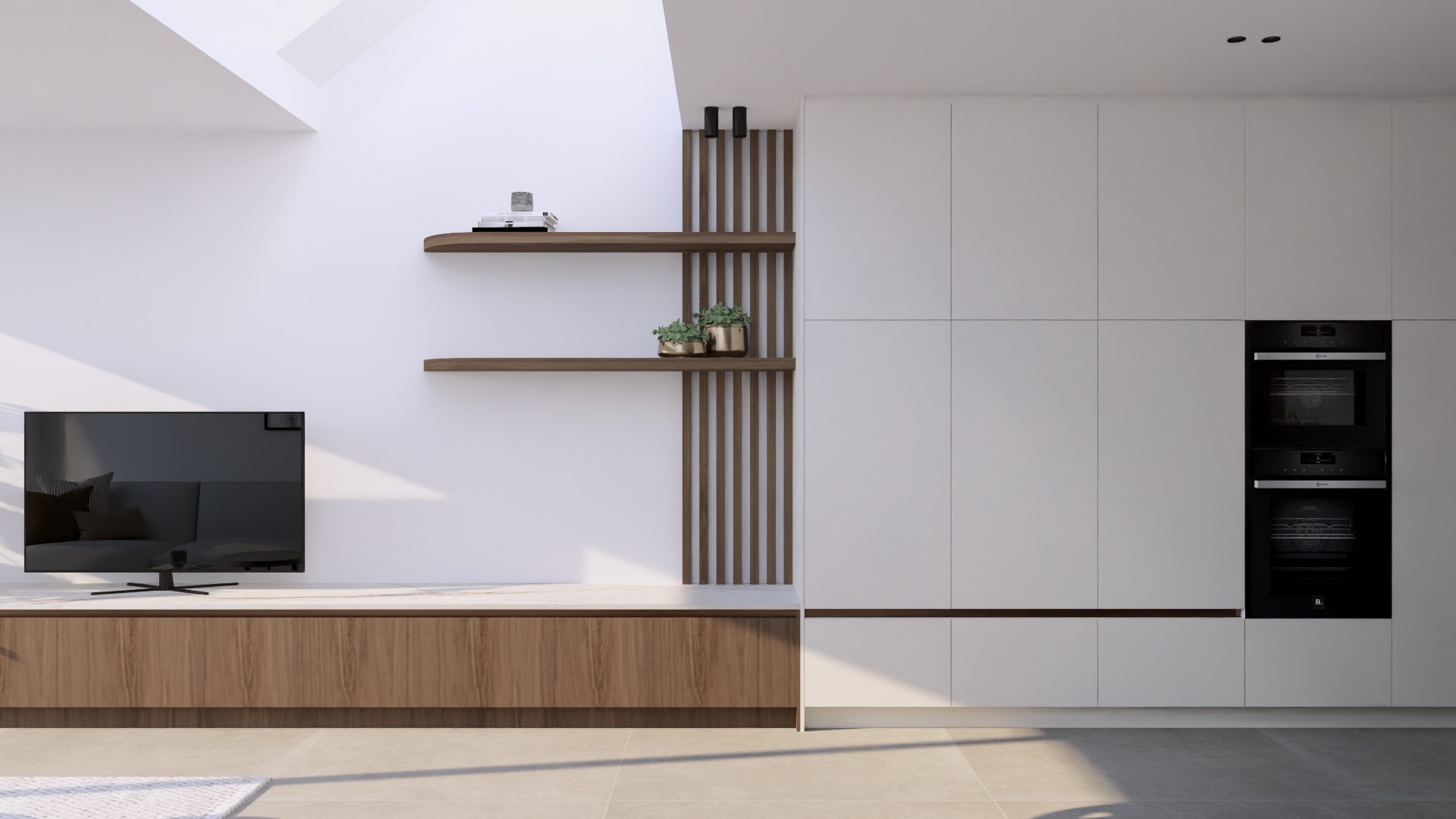 Alle technische meters werkten we weg in een kast onder de trap, die naadloos overloopt in een vestiaire en vervolgens in de hoge kastenwand van de keuken. Die kastenwand loopt dan weer door in een laag tv-meubel, waardoor één rustige lijn ontstaat en de benedenverdieping visueel veel groter oogt. Dit soort integratie is essentieel bij kleine ruimtes optimaal benutten: geen losse meubels of visuele ruis, maar een geheel dat klopt en elke centimeter slim inzet.
